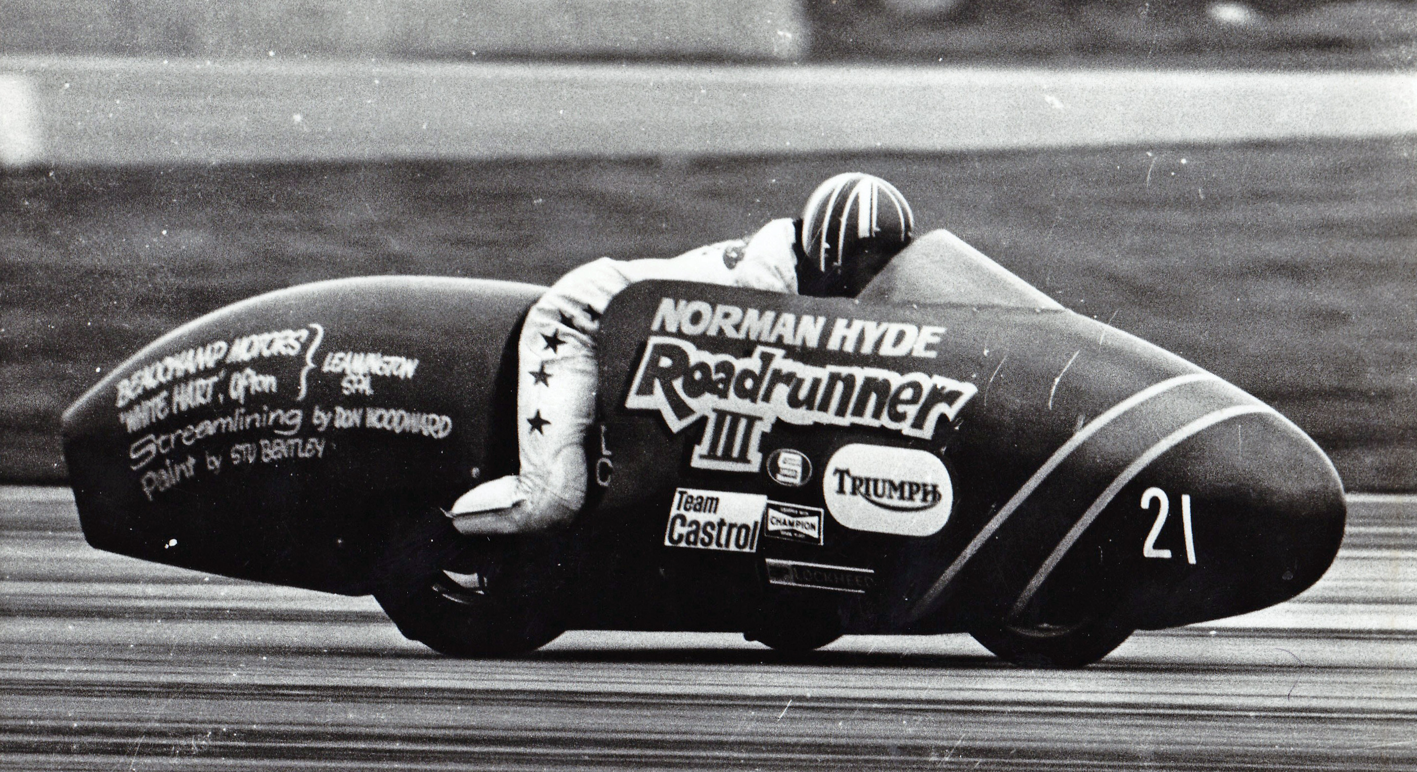 Despite the wind giving him problems in keeping the outfit in a straight line and the front wheel lifting on reaching top speed, Norman kept the Trident engine screaming flat out as Roadrunner III shot through the timing lights. A check of the timing sheet showed he had missed out on the record by just 0.2 mph!