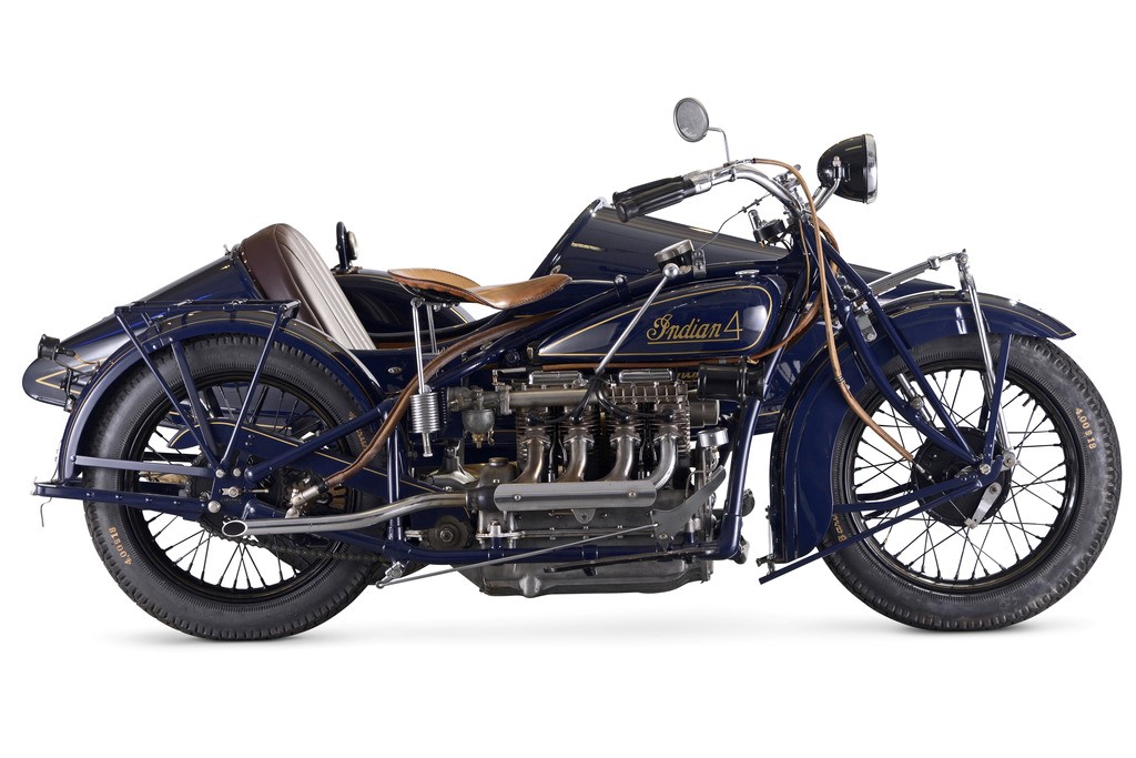 From left: Property of James May, the 1967 Honda CB450 ‘Black Bomber’ sold for £5,980, and the 1930 Indian 1,265cc Model 402 Four-cylinder Combination, sold for £97,700