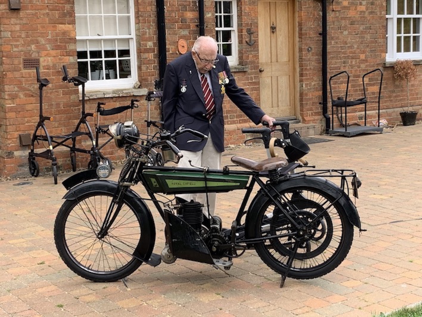 For the film shoot, Mark Bryan of H&H Classics, provided a 1920’s Royal Enfield Model 200, supplied by Hitchcocks Motorcycles in Solihull. It was one of the first bikes that Sir Tom restored after discovering it as a barn-find, and which he rode around in his garden as a very young man.