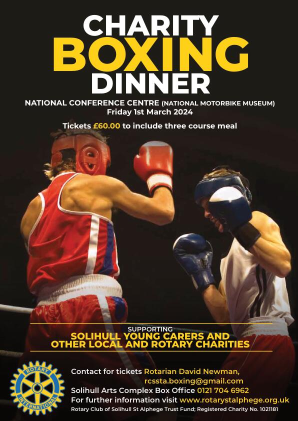 Tickets £60 including 3 course meal – contact Rotarian Darren Newman (rcssta.boxing@gmail.com) or for further information: www.rotarystalphege.org.uk