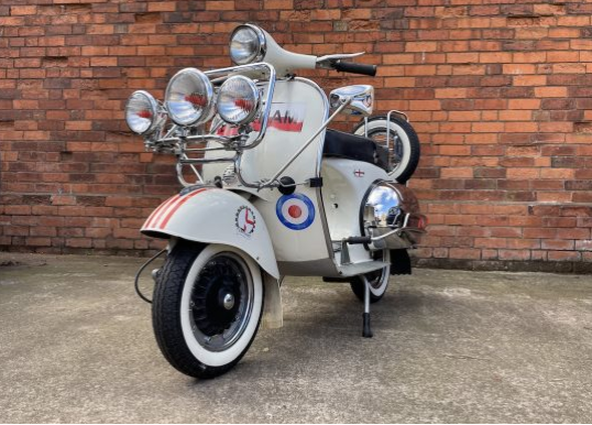 The ‘English Beckham Vespa’ in the advertisement is actually a Spanish built 1962 MotoVespa 150S but was designed in English style and kit colours in white with a number of typical English decals and badges. It also has ‘mod style’ accessories including a front rack with lights and mirrors, rear rack with spare wheel and a whip aerial (now broken).