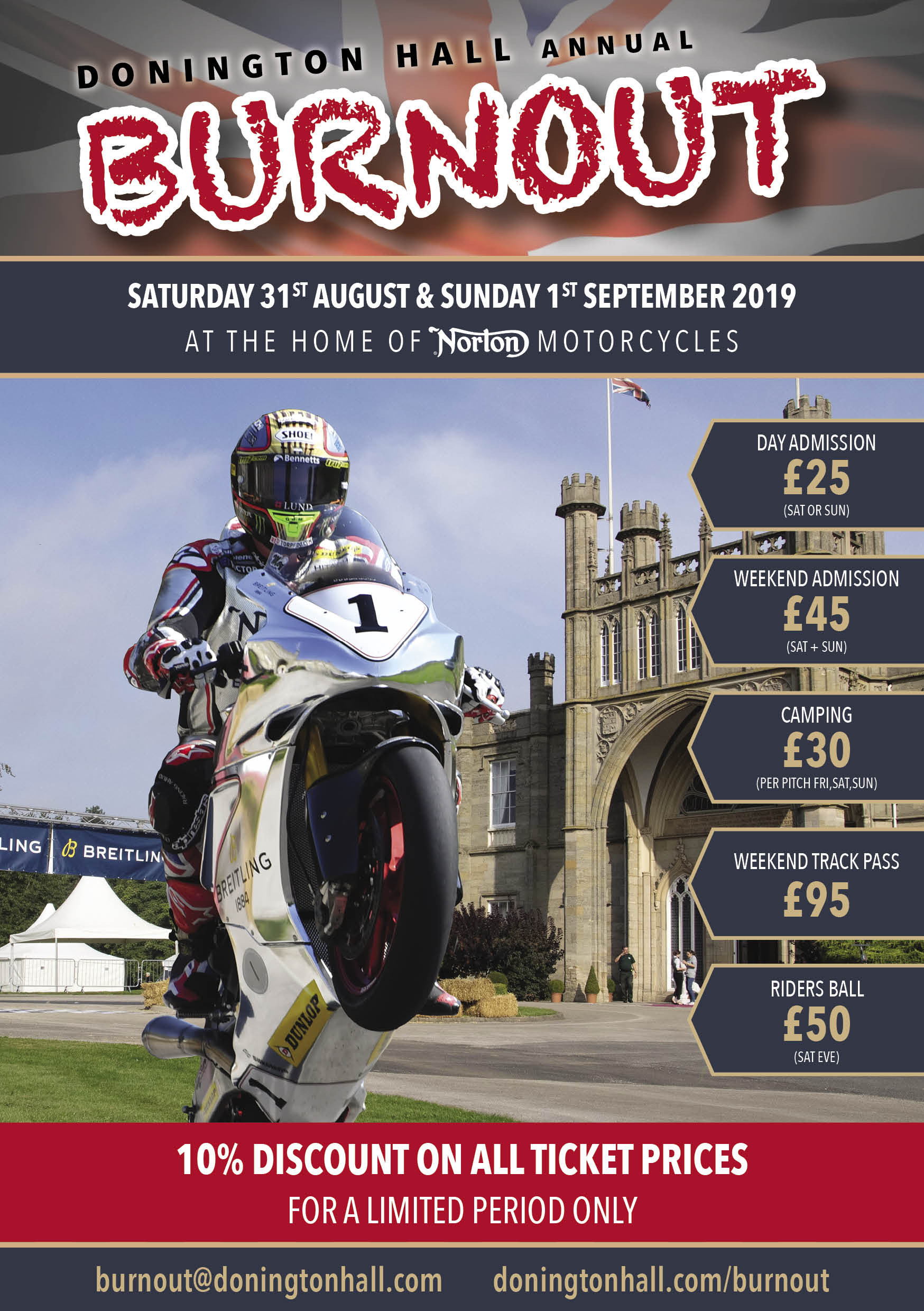 Donington Hall, the home of Norton Motorcycles are delighted to announce the dates for Burnout 2019 – Saturday 31st August and Sunday 1st September 2019.