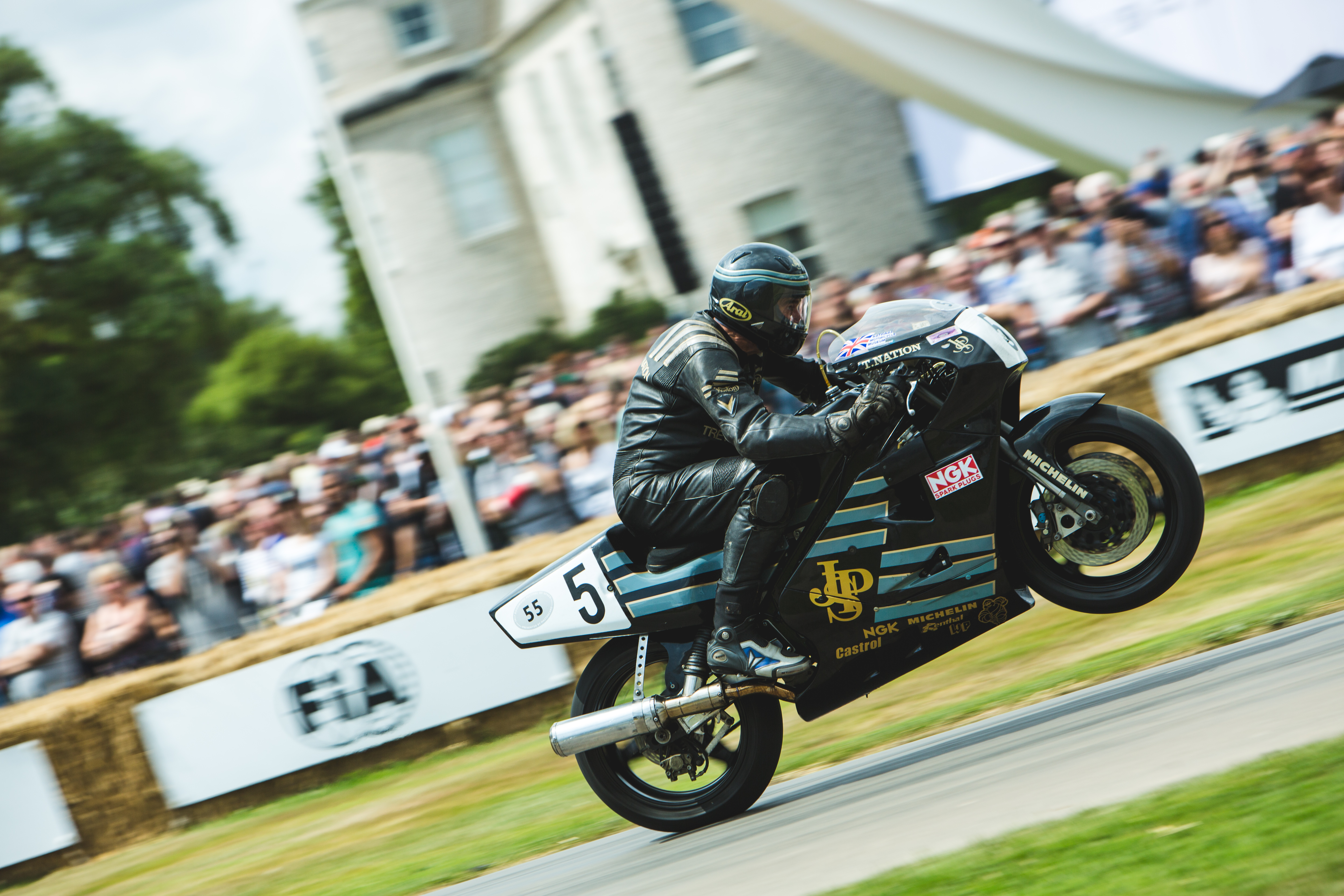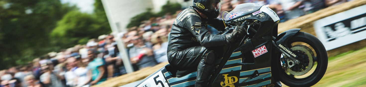 Trevor Nation all ready to go before riding the National Motorcycle Museums ex-Trevor Nation Rotary Norton on the hill at this year’s Goodwood Festival of Speed.