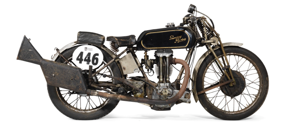 Another significant pre-war competition machine in the sale is the 1929 Grindlay-Peerless 498cc Brooklands ‘Hundred Model’ (£45,000-55,000), also known as the ‘Lacey Replica’. Bill Lacey became the first man to cover 100 miles in an hour on British soil in August 1928 aboard a Grindlay-Peerless, and the Coventry factory lost no time in bringing out a replica of his machine to capitalise on sales: the Brooklands ‘Hundred Model’. However, lacking the resources of larger rivals and perhaps over-estimating the demand for such a specialised piece of equipment, they sold no more than five or six machines.