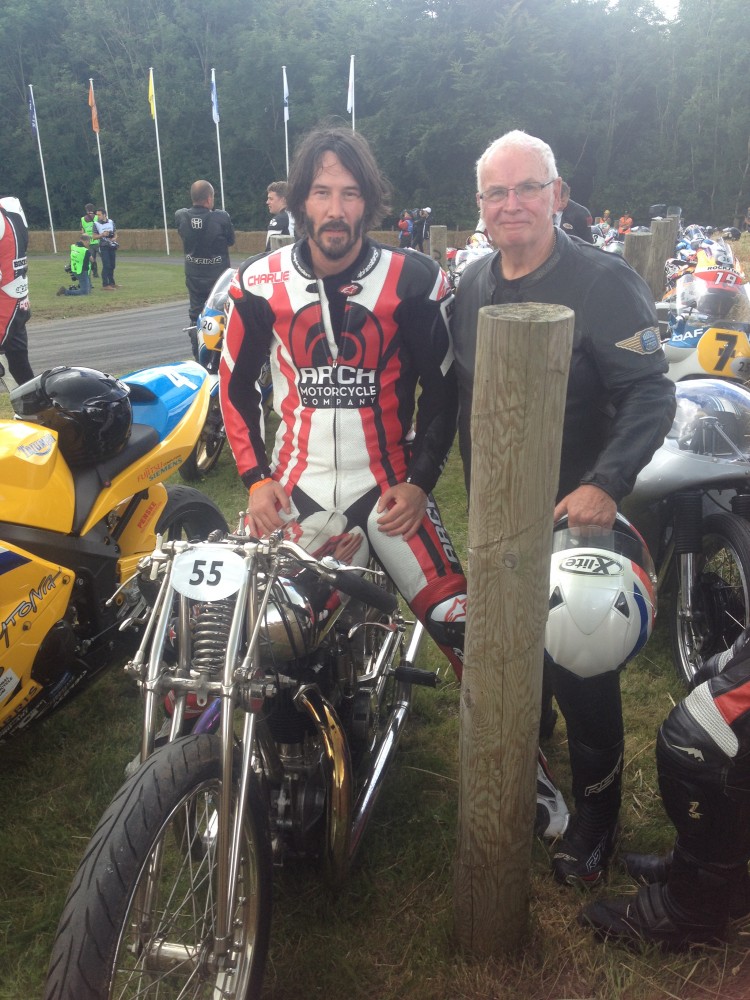 Keanu can be seen in the company of classic race engine tuner Fred Walmsley, who was riding the machine on behalf of the National Motorcycle Museum.
