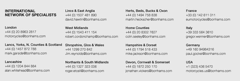 Visit bonhams.com/autumnstafford for a preview of the incredible lots consigned to the Autumn Stafford Sale. To discuss any aspect of buying or selling collectors’ motorcycles at auction including valuations for probate, market and insurance, please contact the London office, your nearest specialist, or visit bonhams.com/motorcycles to submit a complimentary auction appraisal request.