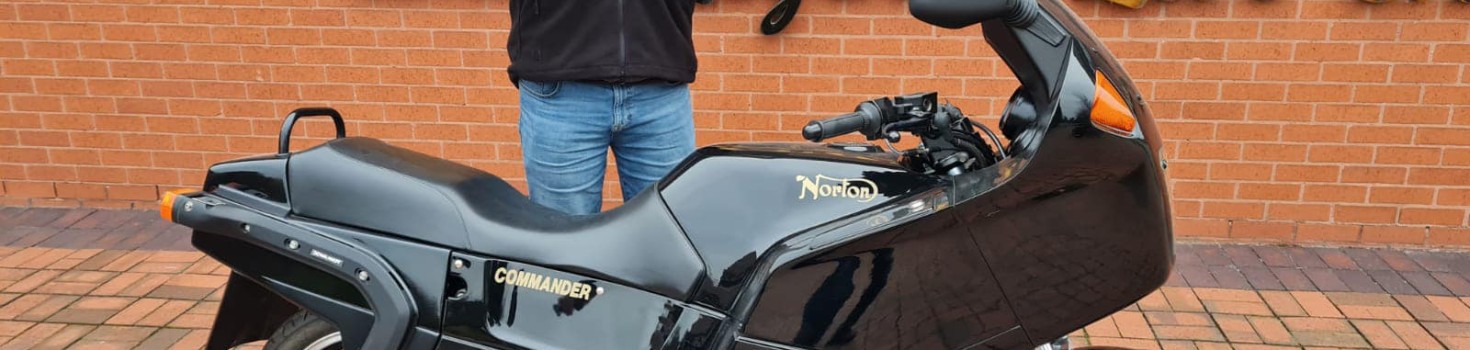 Andy Mayer, who won 2nd prize in our summer raffle, collected his prize today, a gorgeous new/old stock 1993 Norton Commander Rotary.