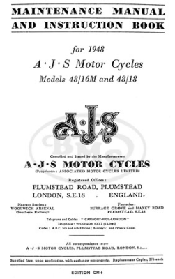 This 1948 Maintenance Manual and Instruction Book covers models: – AJS 48/16M – AJS 48/18