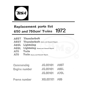 BSA 1972 Illustrated Spare Parts Manual A65T Thunderbolt A65L Lightning A70 Twin from engine no. JG00101. ALP/2110