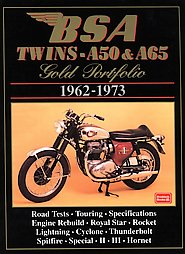 BSA Twins A50 & A65 Gold Portfolio 1962-1973 – RM Clarke This volume contains articles on Royal Star, Rocket, Cyclone Lightning, Thunderbolt, Spitfire, Special II & III, and Hornet. Included are road test reports from such popular magazines as Cycle World, Motorcycle and Motorcycle Mechanics. Also included are articles on new model reports, performance data, history, service notes, engine analysis, specifications and tuning.