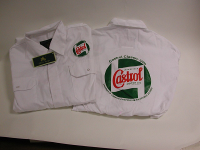 White mechanic overalls with Castrol logo on the back and Castrol badge on the front