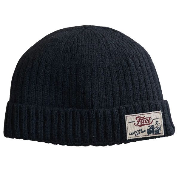 100% wool, snug fit, short beanie in a classic dockyard / fisherman design with Fuel detail badging