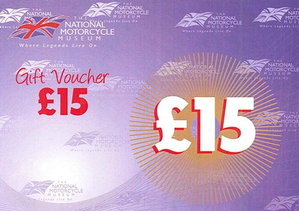Gift Voucher £15 Your National Motorcycle Museum Gift Voucher can be redeemed either in the Motorcycle Museum, Museums Shop or Restaurant. Gift Vouchers cannot be refunded or exchanged for cash or other denominated vouchers. If the purchase is for a higher amount than the face value of the voucher(s), the difference can be made up with cash or card but if the purchase is for a lower amount, no change can be given. National Motorcycle Museum Gift Vouchers cannot be used in conjunction with any special promotions, coupons or cards and cannot be replaced if lost, stolen or damaged.