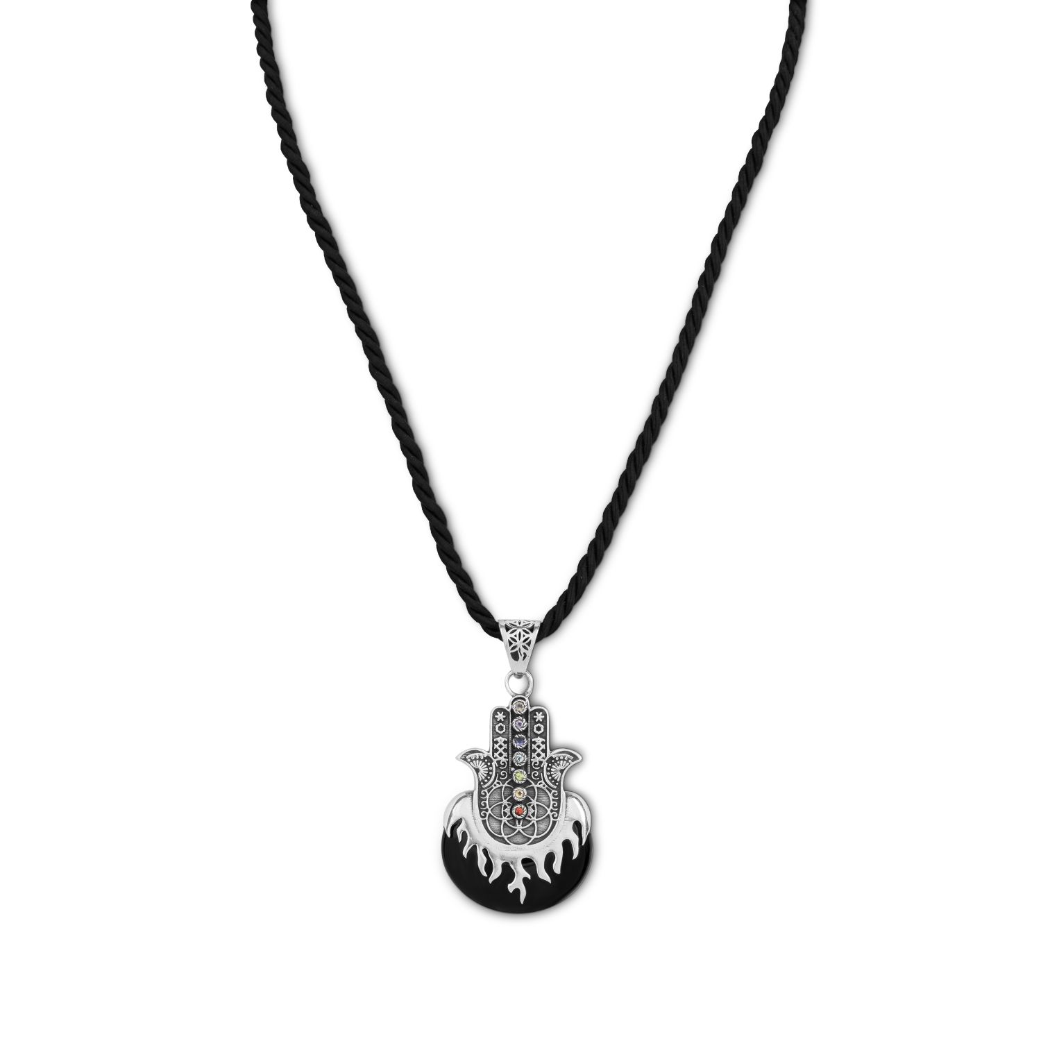 A large Onyx and 925 Sterling Silver Hamsa featuring flame