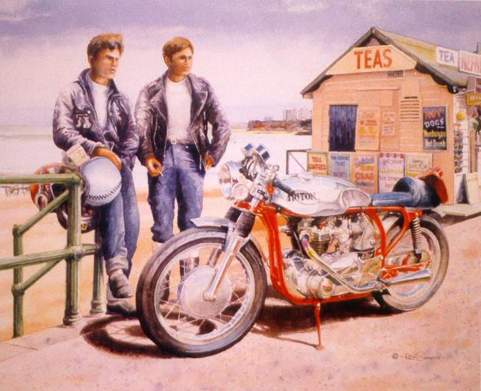 Once again the title was in Roy’s head before he had any idea for the actual composition, then on a day out at the seafront in Paignton, Devon, were two guys in leather rockers jackets having a cuppa at one of the, now rare, seafront tea huts. There was no bike in sight, but Roy’s imagination went to work and decided the ‘Leader of the pack’ would undoubtedly be on a Triton, one of his all-time favourite Café racer machines. The red framed bike used as reference was one he photographed at a bike show in Somerset.