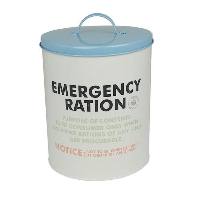 – Large storage tin for biscuits or all your culinary delights – In blue and grey retro wartime colours – Size: 24cm tall x 19cm diameter