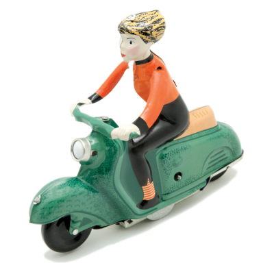 This sassy little modern miss scoots around with a clockwork motor living la dolce vita. Available in blue, yellow and ivory also. This is a part of our wonderful Tin Treasures range. Made to an exacting process with a skill and attention lacking in some of today’s mass produced plastic toys. Every tin treasure starts as a flat sheet of metal which is printed, cut and then passed through numerous tooling stations before being assembled by hand. As well as being beautiful clockwork novelties, these tin toys are sure to become collector’s pieces. WARNING: They are nostalgic replica products for adult collectors only and are not designed to comply with toy safety legislation.