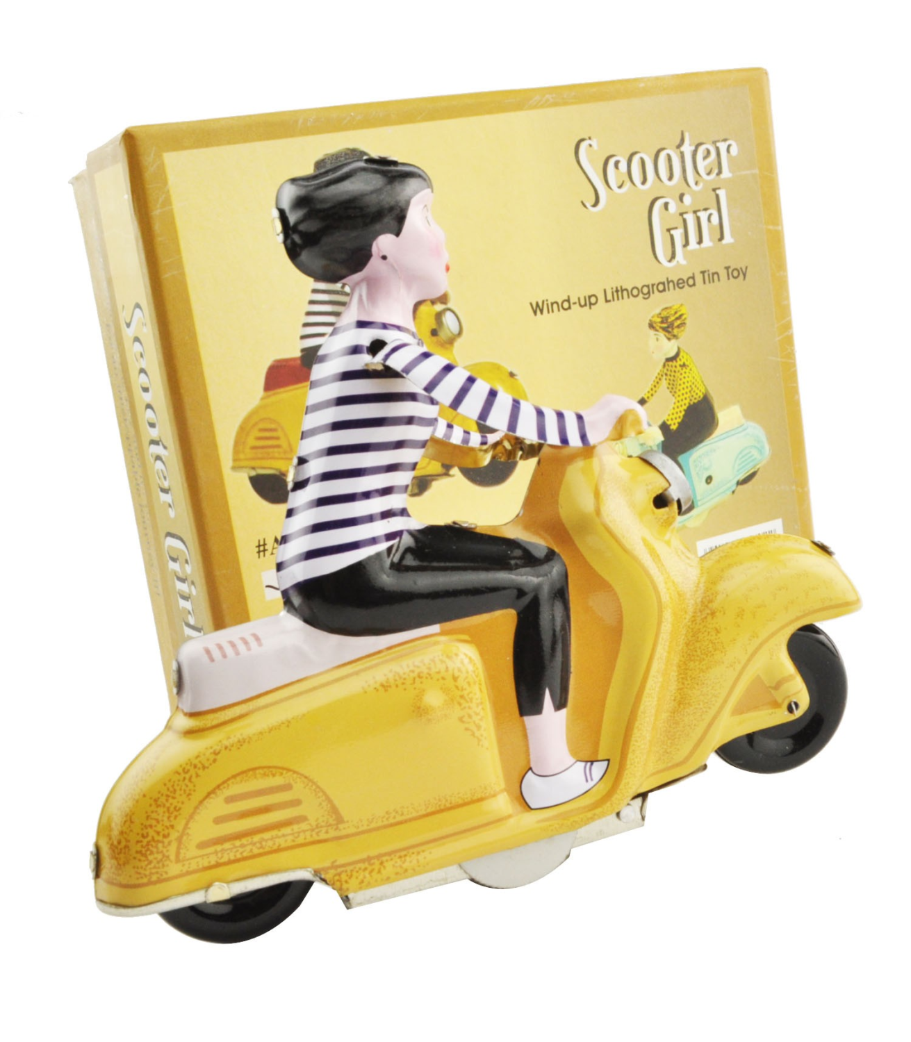 This sassy little modern miss scoots around with a clockwork motor living la dolce vita. Available in blue, yellow and ivory also. This is a part of our wonderful Tin Treasures range. Made to an exacting process with a skill and attention lacking in some of today’s mass produced plastic toys. Every tin treasure starts as a flat sheet of metal which is printed, cut and then passed through numerous tooling stations before being assembled by hand. As well as being beautiful clockwork novelties, these tin toys are sure to become collector’s pieces. WARNING: They are nostalgic replica products for adult collectors only and are not designed to comply with toy safety legislation.