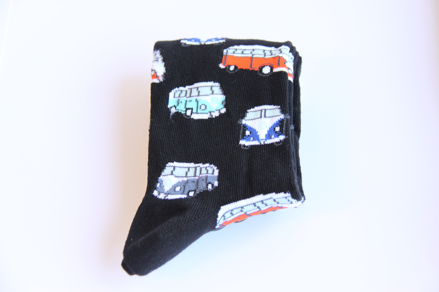 A repeat pattern of coloured camper vans tastefully laid out on the tie. Smart and discrete.