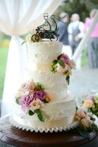 If you want the cake to be rustic, you can go for a traditional three-tiered buttercream cake and add a Motorcycle cake topper complete with road signs and trees or for a more relaxed style, how about a cake that resembles a bike tyre?