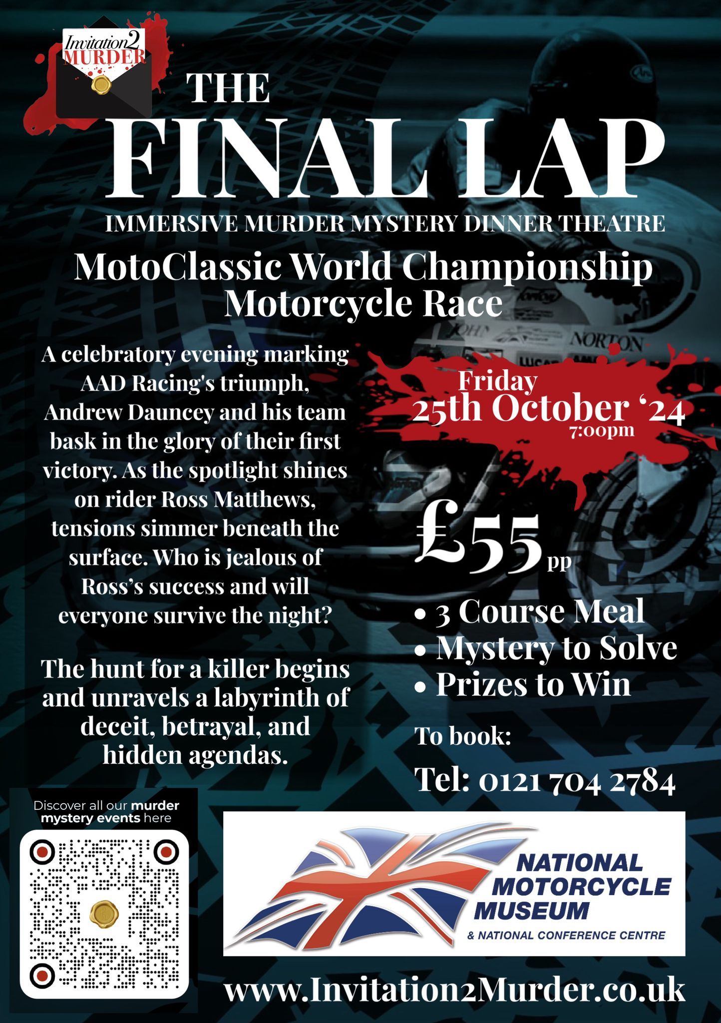 Extend your Museum Live weekend with an evening of intrigue and suspense at “The Final Lap” murder mystery event! Join us at the National Conference Centre, part of the National Motorcycle Museum, on Friday, October 25, 2024, at 7:00 PM.